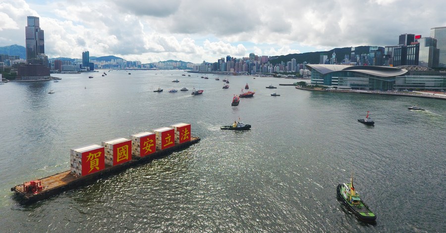 2020年7月1日,一艘驳船出现在香港维多利亚港湾。五面写有“贺国安立法”黄色大字的政府红色横幅紧贴在集装箱侧面。在香港移交主权23年后的纪念日,一夜之间,与北京不同的政治意见与象征性符号被非法化,例如支持香港,台湾,新疆和西藏独立的运动。国安法通过基础设施将香港政府与当局从民主价值观重新定位到全球性中国。